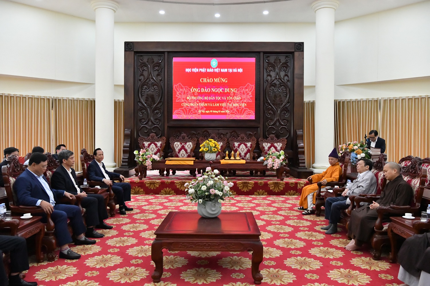 Phát biểu tại buổi làm việc, Bộ trưởng Bộ Dân tộc và Tôn giáo Đào Ngọc Dung đánh giá cao những kết quả của Học viện Phật giáo Việt Nam nói chung, và Học viện Phật giáo Việt Nam tại Hà Nội nói riêng, trong việc đào tạo, bồi dưỡng các tăng ni, phật tử trở thành những con người có tài, có đức, góp phần lan tỏa, phát huy giá trị tốt đẹp của Phật giáo cũng như đóng góp vào việc củng cố khối đại đoàn kết dân tộc. Bộ Trưởng bày tỏ mong muốn Học viện Phật giáo Việt Nam tăng cường trao đổi, phối hợp với các đơn vị trực thuộc Bộ, trong đó có Học viện Dân tộc để nâng cao hiệu quả trong công tác tôn giáo và công tác bồi dưỡng, đào tạo trong lĩnh vực tôn giáo.
